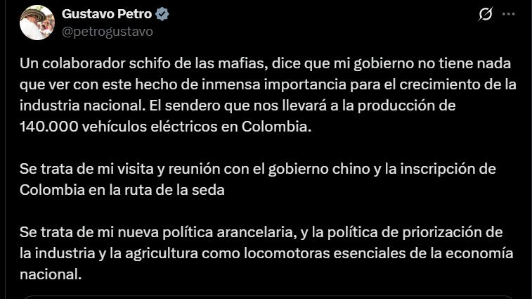 Dicha publicación fue compartida por el mandatario de los colombianos quien además agregó que un colaborador de las mafias, decía que su gobierno no tenía nada que ver con este hecho de inmensa importancia para el crecimiento de la industria nacional, “El sendero que nos llevará a la producción de 140.000 vehículos eléctricos en Colombia”, declaró el presidente.