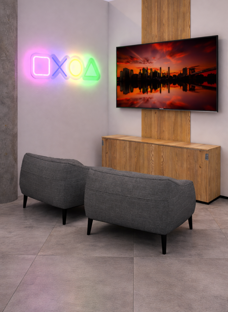 Respecto a la sala gamer, se realizarán intervenciones en el piso y se incorporará mobiliario acorde con este tipo de espacios. También se prevé la instalación de televisores y consolas, junto con la adecuación de redes eléctricas y de conectividad necesarias para su funcionamiento.