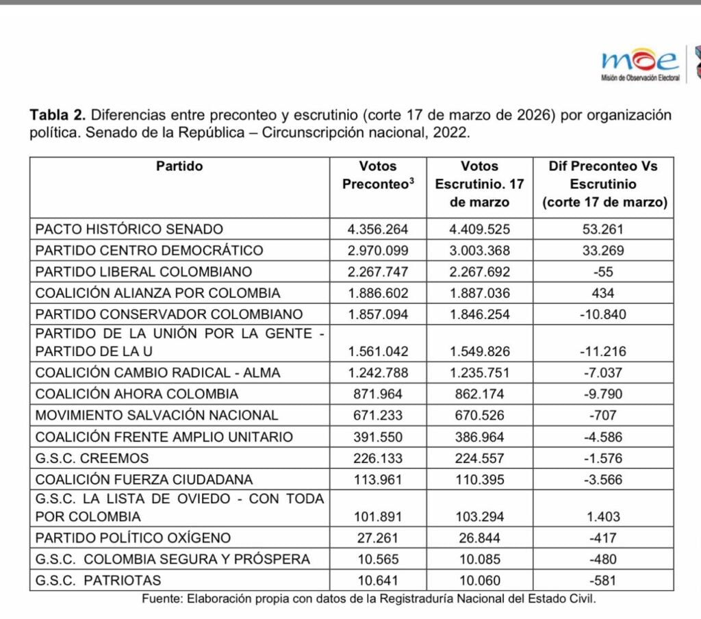 En el análisis por organizaciones políticas, tanto el Pacto Histórico como el Centro Democrático presentaron variaciones dentro de este margen, al igual que otras colectividades. Estos ajustes se distribuyeron entre las distintas listas, sin alterar de manera significativa la composición general de los resultados.