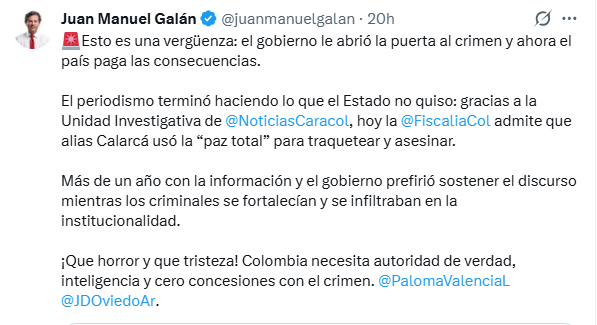 Desde distintos sectores políticos se emitieron reacciones frente a la situación. El exsenador Juan Manuel Galán calificó lo ocurrido como una “vergüenza” y afirmó que la información conocida evidenció fallas en la respuesta institucional. En sus declaraciones señaló que, según su criterio, el Estado no actuó oportunamente frente a los hechos revelados y pidió fortalecer las acciones de inteligencia y seguridad.