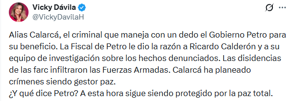 Por su parte, la periodista y excandidata presidencial Vicky Dávila se refirió a la relación entre el líder disidente y el Gobierno, señalando que las revelaciones coincidían con investigaciones periodísticas previas. En sus mensajes también mencionó presuntos vínculos de estas estructuras con instituciones del Estado.