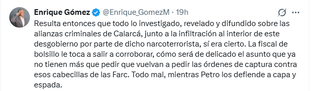 El abogado Enrique Gómez afirmó que los hechos divulgados respaldan denuncias previas sobre la presencia de organizaciones ilegales en escenarios institucionales. En su pronunciamiento sostuvo que la situación obligaría a retomar órdenes de captura contra integrantes de estas estructuras.