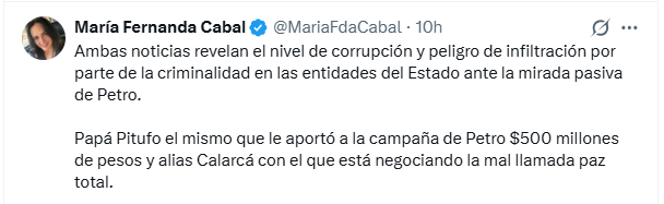 Desde el Congreso, la senadora María Fernanda Cabal hizo referencia a riesgos de infiltración en entidades del Estado y mencionó posibles relaciones entre actores ilegales y procesos políticos, según sus declaraciones públicas.