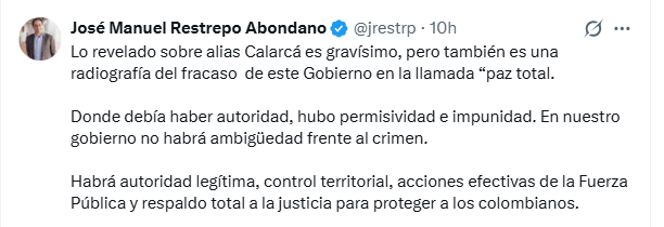 En la misma línea, el exministro José Manuel Restrepo señaló que lo conocido representa un impacto para la política de seguridad del Gobierno. En sus afirmaciones, indicó que estos hechos reflejan problemas en la implementación de la estrategia de “paz total” y planteó la necesidad de reforzar acciones institucionales.