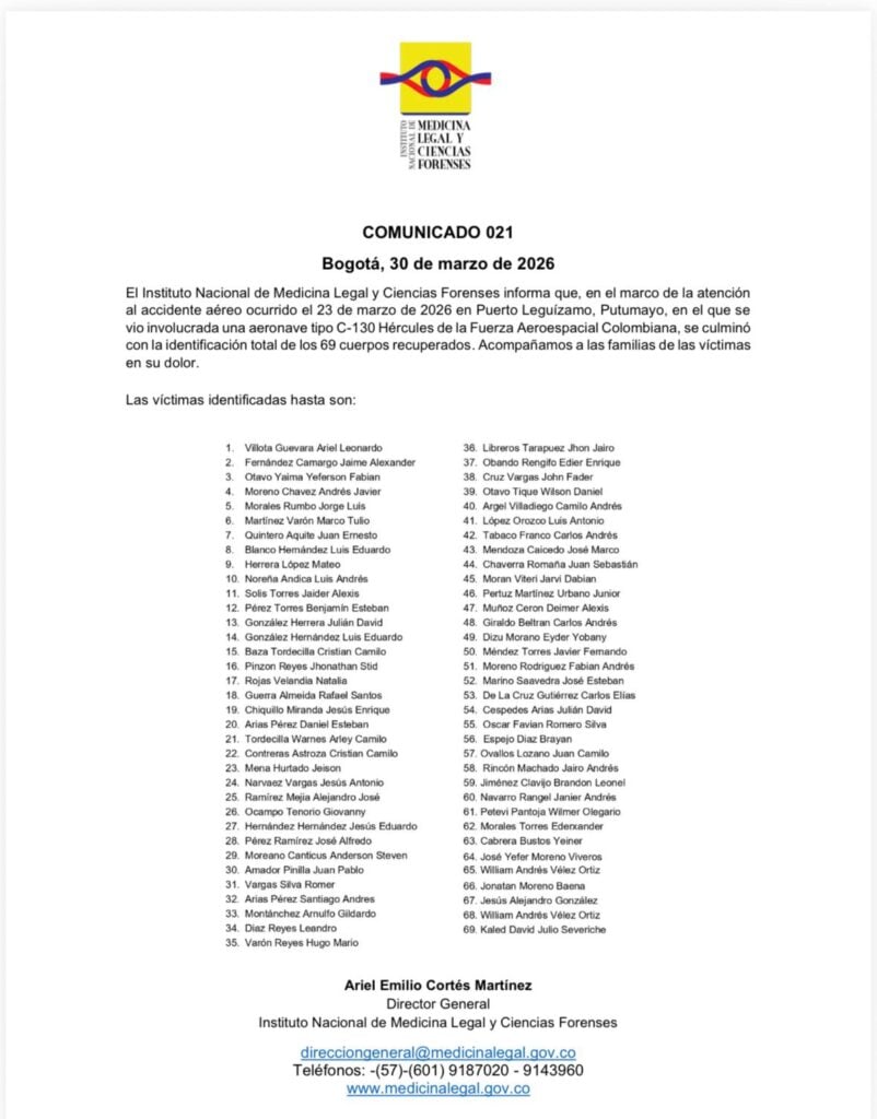 El Instituto Nacional de Medicina Legal y Ciencias Forenses confirmó que fueron identificados en su totalidad los 69 cuerpos de las víctimas del accidente aéreo ocurrido el pasado 23 de marzo de 2026 en Puerto Leguízamo, Putumayo, en el que se vio involucrada una aeronave tipo C-130 Hércules de la Fuerza Aeroespacial Colombiana.