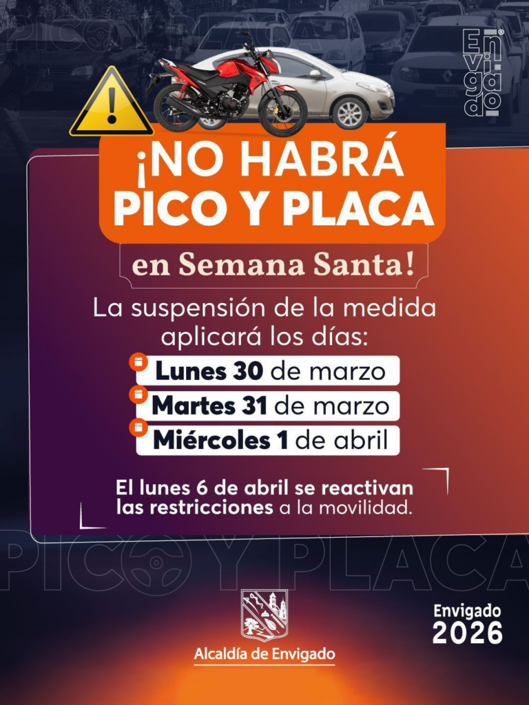 De acuerdo con la información oficial, en Envigado la restricción no se aplicará los días lunes 30 de marzo, martes 31 de marzo y miércoles 1 de abril. La medida se retomará el lunes 6 de abril, conforme a la rotación vigente establecida para el semestre. La decisión se adopta en el contexto del incremento en los desplazamientos por actividades religiosas y viajes durante estos días.