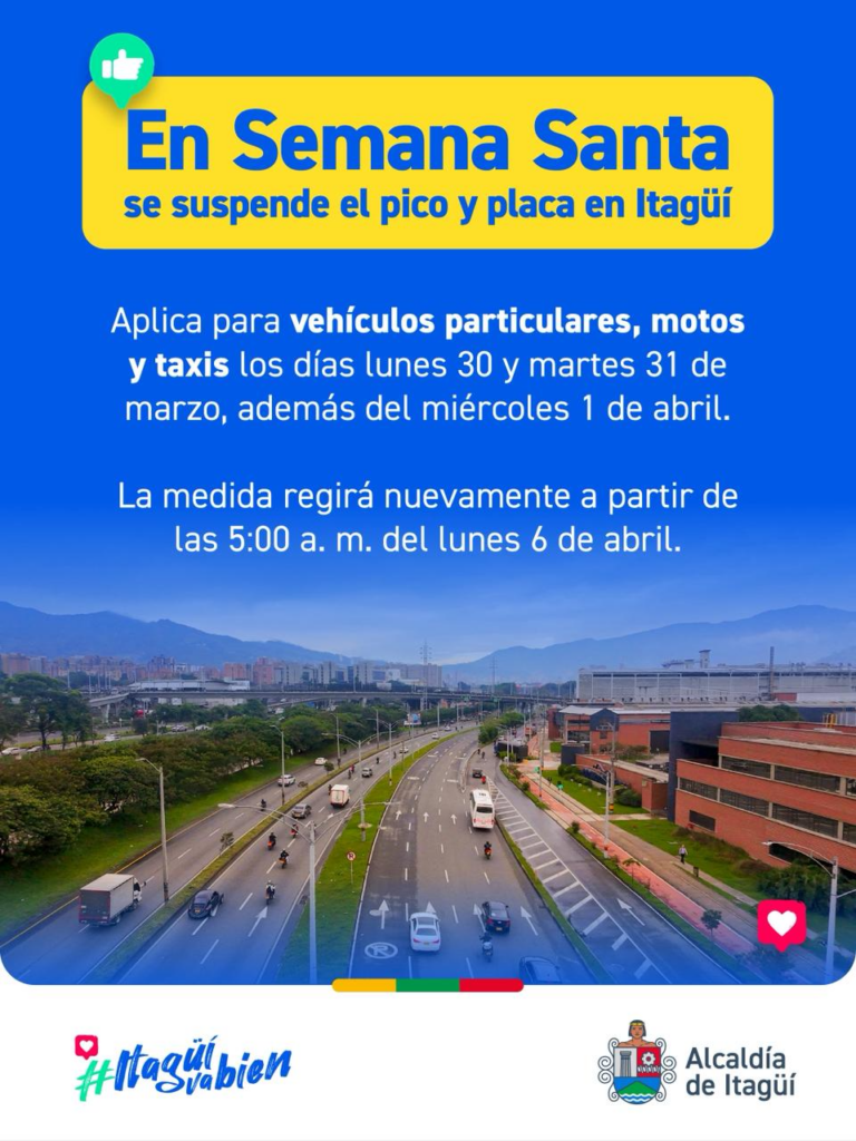 Por su parte, la Alcaldía de Sabaneta informó que se acoge a la suspensión de la restricción vehicular en el marco de la Semana Santa. En este caso, la medida aplicará durante los días lunes 30, martes 31 de marzo y miércoles 1 de abril, con el objetivo de facilitar el tránsito tanto de residentes como de visitantes que se movilizan por las principales vías del municipio.