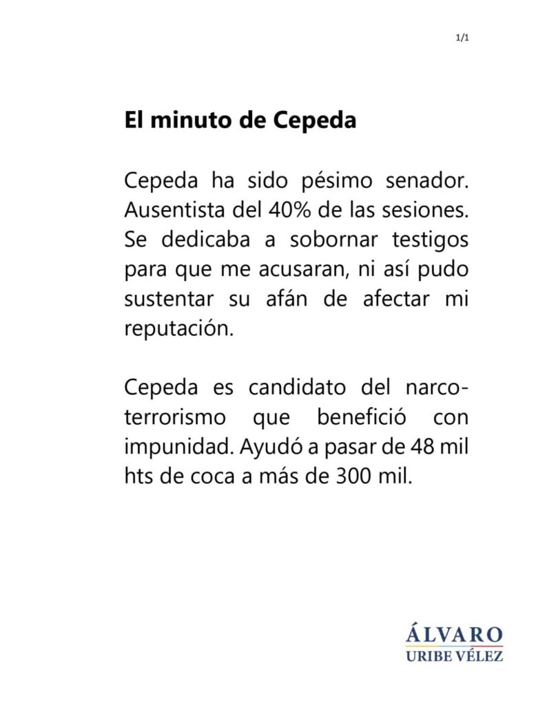 El exmandatario también fue más allá en sus críticas al asegurar que “Cepeda es candidato del narcoterrorismo que benefició con impunidad” y que “ayudó a pasar de 48 mil hts de coca a más de 300 mil”.Posteriormente, Uribe reforzó sus cuestionamientos al señalar que el congresista “es exponente de un vicio de corrupción: llegar al Senado, registrarse y salir durante la sesión, o presentar excusas para asistir al juicio en mi contra donde dijo que no le constaba aquello de lo cual me ha acusado”.