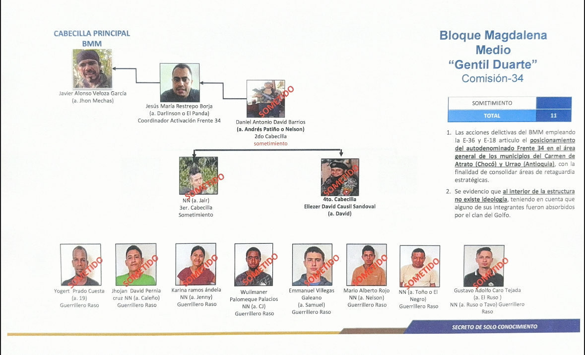 De acuerdo con la información conocida, la estructura que se sometió corresponde a la Comisión 34 del Bloque Magdalena Medio “Gentil Duarte”, integrada por 11 personas, entre cabecillas y guerrilleros rasos, quienes operaban bajo el autodenominado Frente 34 en zonas de Carmen de Atrato, en Chocó, y Urrao, en Antioquia.