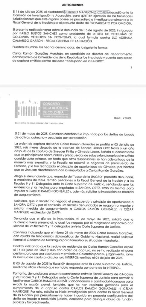 La investigación responde a una denuncia presentada por la Red de Veedurías, en la que se advierte sobre una “presunta conveniencia” entre la fiscal general y los fiscales delegados 9 y 11 ante la Corte Suprema de Justicia. Según el documento radicado, dicha relación habría facilitado que González viajara hacia Nicaragua, con lo cual habría evadido los procesos judiciales en su contra. La denuncia plantea que la salida del país se produjo sin que existiera una actuación explícita que lo impidiera y que, presuntamente, los funcionarios tenían conocimiento de su situación.