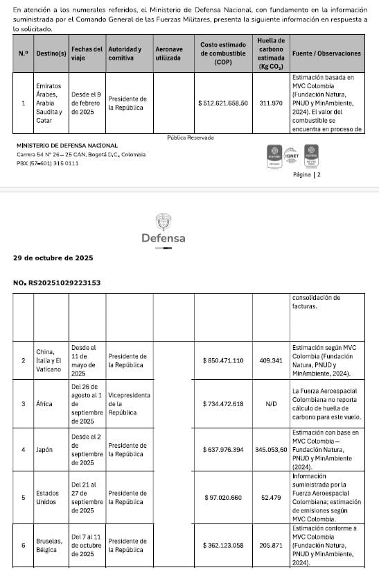 La información entregada por el Ministerio de Defensa fue solicitada en el marco del control político ejercido por distintos sectores, que han pedido mayor transparencia en los gastos del Gobierno Nacional relacionados con los viajes del jefe de Estado y su comitiva.
