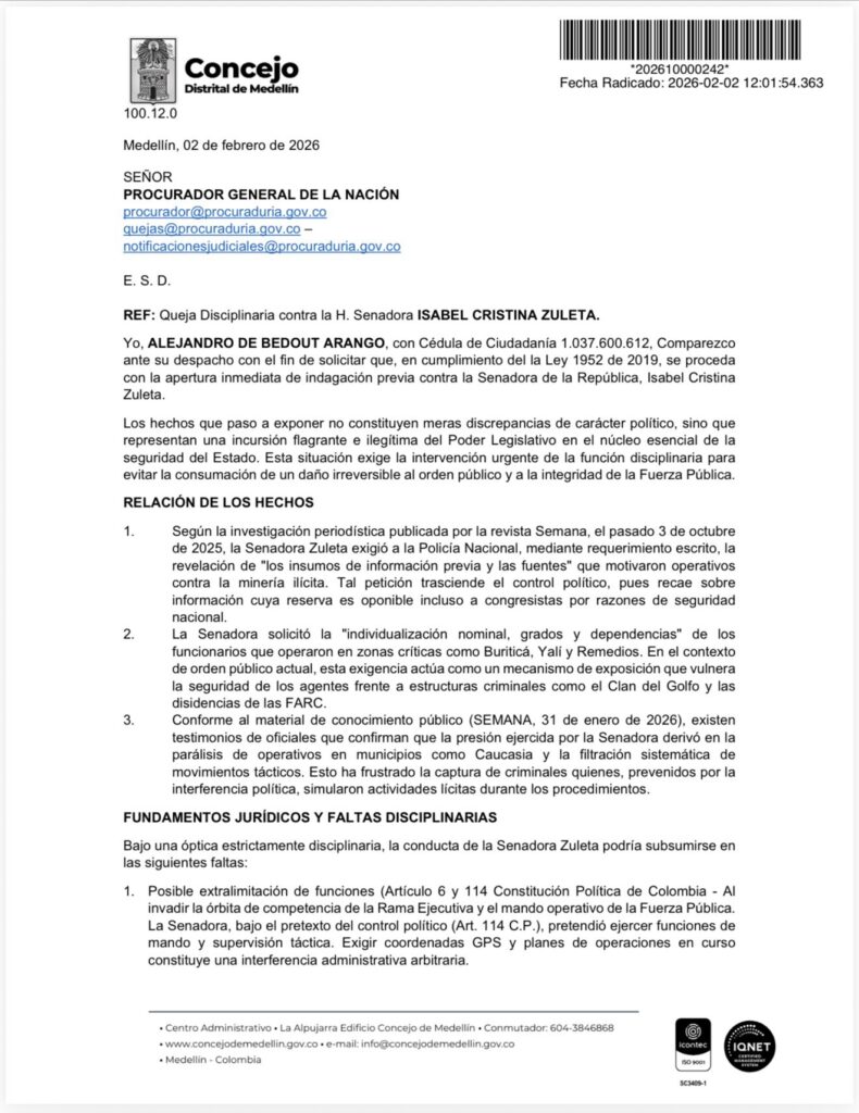 El concejal de Medellín Alejandro de Bedout Arango radicó este 2 de febrero una queja disciplinaria ante la Procuraduría General de la Nación contra la senadora Isabel Cristina Zuleta, solicitando la apertura inmediata de una indagación previa por una presunta extralimitación de funciones en asuntos de seguridad del Estado.