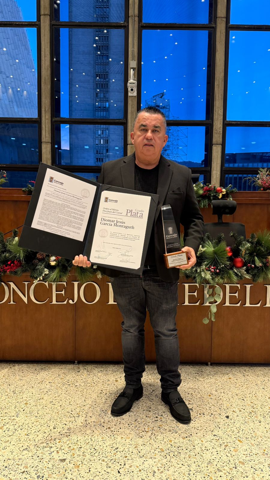 El Concejo de Medellín entregó hoy la Condecoración Orden al Mérito Don Juan del Corral, en grado Plata, a Diomar García, en un acto protocolario realizado para reconocer su contribución al desarrollo social, cultural y económico del territorio. Esta distinción, considerada entre las más representativas del cabildo municipal, se otorga a personas cuya labor ha tenido incidencia directa en procesos que impactan a la ciudad y al país.