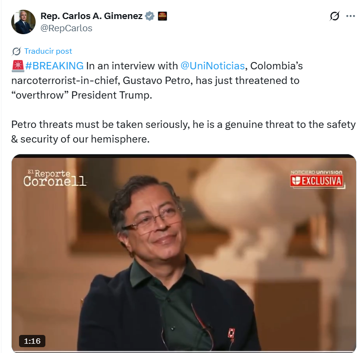 En otra publicación, Giménez insistió en que el jefe de Estado colombiano habría “amenazado” con derrocar a Donald Trump, pese a que en la entrevista no se usó esa expresión. “Sus amenazas contra el presidente Donald Trump están siendo tomadas muy en serio. El Congreso de Estados Unidos condena todo tipo de amenazas”, manifestó. Además, pidió a los “colombianos decentes” tomar “las riendas del país antes de que sea demasiado tarde”.