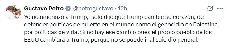 Ante las declaraciones del congresista, el presidente Gustavo Petro respondió también desde su cuenta de X. En su mensaje, negó haber hecho amenazas contra el mandatario estadounidense y aseguró que su comentario fue malinterpretado. “Yo no amenazo a Trump. Dije que debía cambiar su corazón y dejar de defender políticas de muerte en el mundo, como el genocidio en Palestina, por políticas de vida”, escribió el jefe de Estado.
