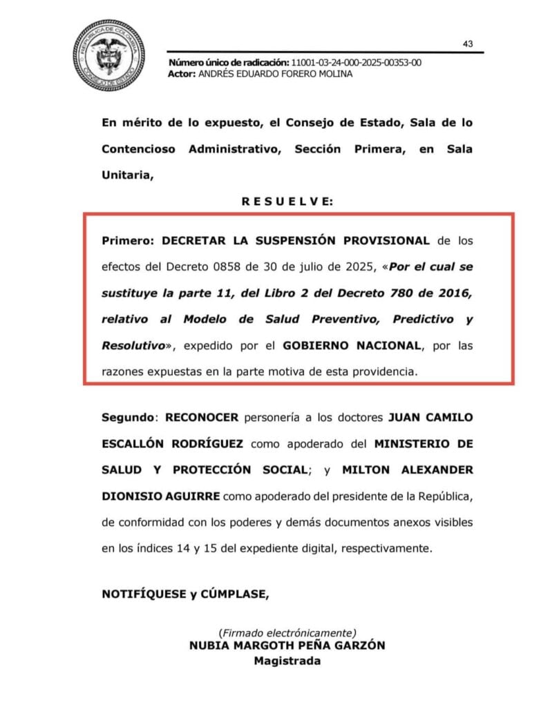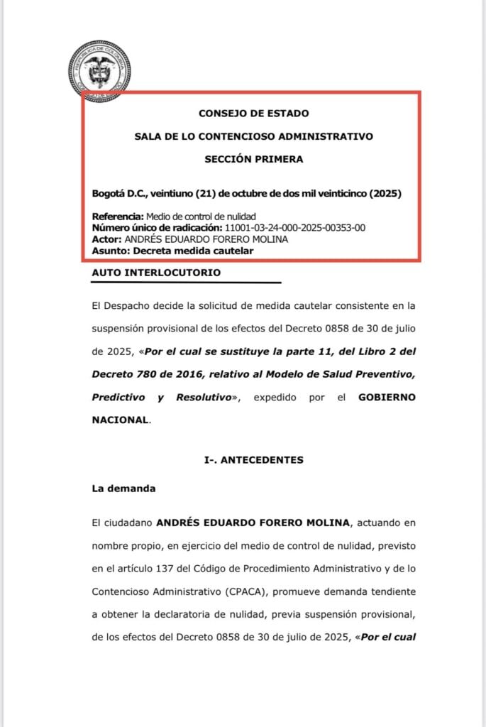 La Sección Primera del alto tribunal determinó que el decreto expedido el 30 de julio de 2025 debía ser suspendido mientras se analiza de fondo su legalidad. En el fallo se señala que el Gobierno habría vulnerado el principio de reserva de ley al adoptar un modelo de salud de alcance nacional que, por su naturaleza, debía ser debatido y aprobado por el Congreso de la República.