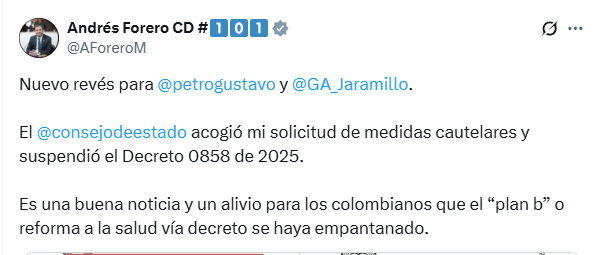 Andrés Forero había afirmado que el Gobierno “se extralimitó al regular elementos estructurales del Sistema de Seguridad Social en Salud”, por lo que solicitó medidas cautelares que fueron acogidas por la corporación judicial.