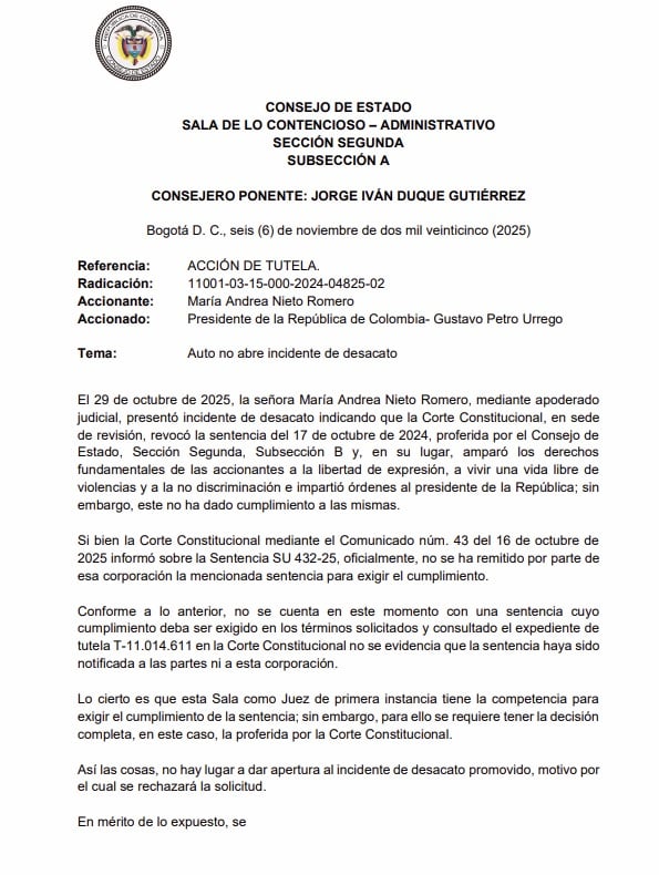 El Consejo de Estado determinó no abrir el incidente de desacato solicitado por la periodista María Andrea Nieto Romero en contra del presidente Gustavo Petro, al considerar que la corporación no ha recibido la notificación oficial de la sentencia de la Corte Constitucional que ordena al mandatario retractarse públicamente por afirmaciones emitidas contra mujeres periodistas.
