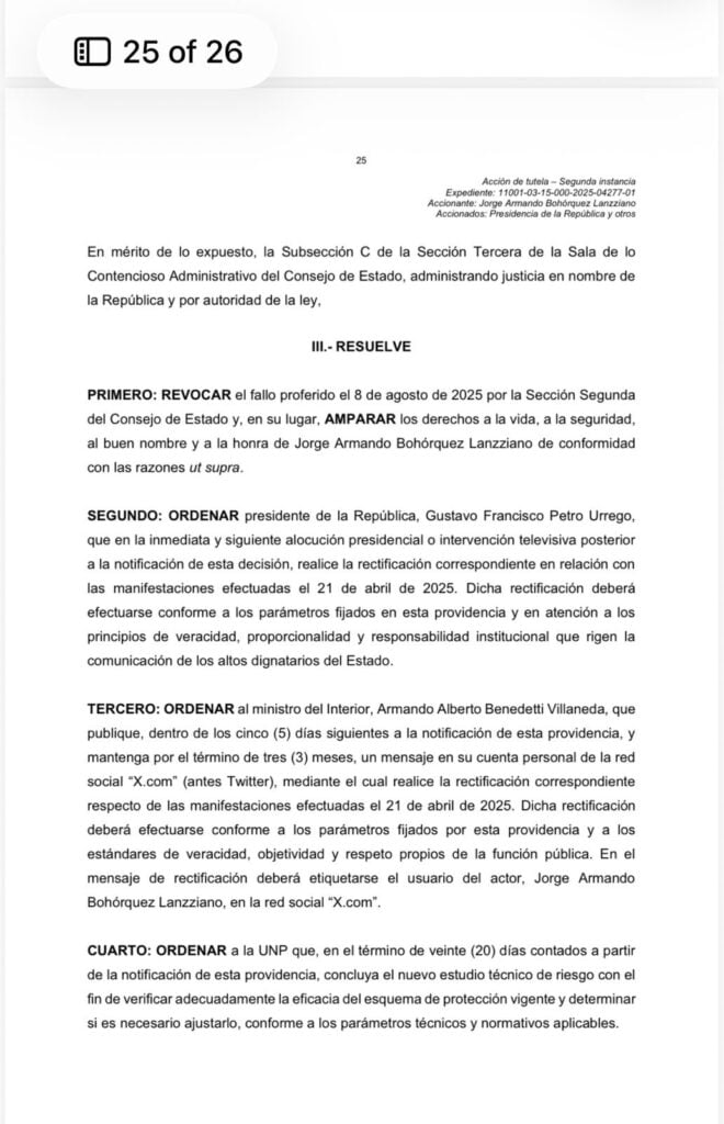 Bohórquez explicó en su tutela que, tras los señalamientos, comenzó a recibir mensajes intimidatorios, algunos con referencias a atentados recientes ocurridos en el país. En entrevistas concedidas a medios nacionales, señaló que responsabilizaba al Gobierno por cualquier afectación a su integridad o a la de su familia.