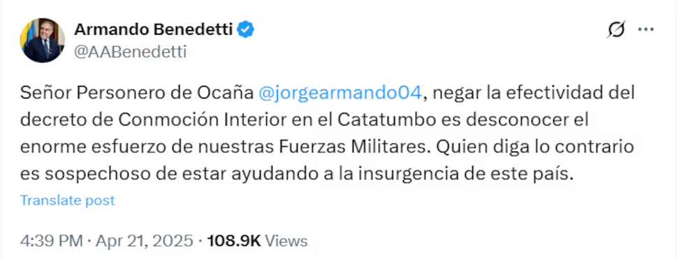 El conflicto surgió cuando Benedetti cuestionó públicamente la postura del Personero frente a la conmoción interior decretada en Norte de Santander y otros municipios del Catatumbo. En mensajes publicados en redes sociales, el Ministro sugirió que la posición de Bohórquez lo hacía “sospechoso” de colaborar con la insurgencia. Jorge Armando Bohórquez respondió que su labor está orientada exclusivamente a la defensa de los derechos humanos y que declaraciones de esa naturaleza implican riesgos adicionales en regiones donde el orden público es frágil.