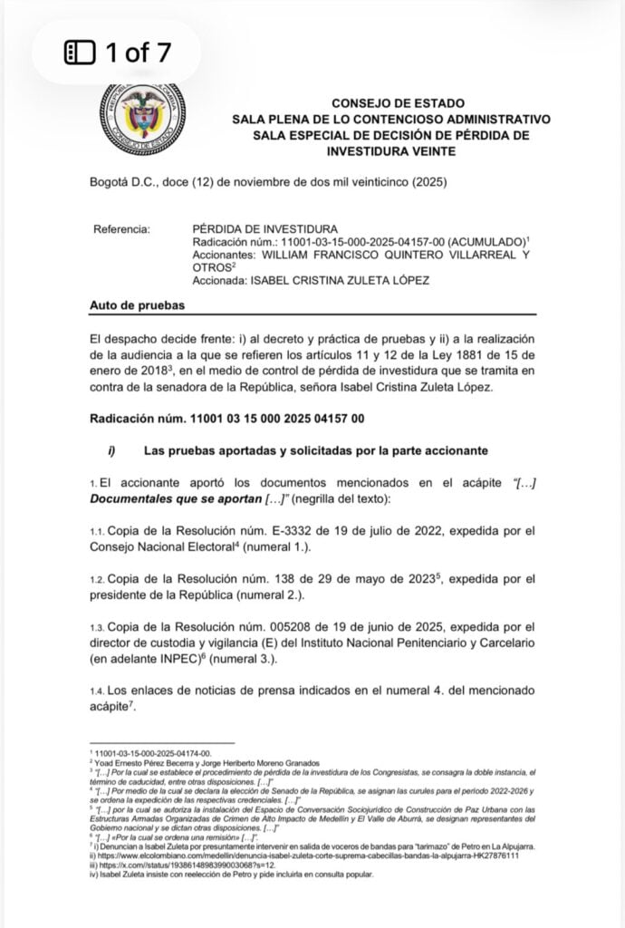 El Consejo de Estado admitió la demanda en agosto de este año y, una vez concluya la recolección del material probatorio, tendrá que programar la audiencia pública de pérdida de investidura. En esa diligencia, las partes podrán intervenir y presentar sus argumentos ante el alto tribunal, que posteriormente tomará una decisión sobre la continuidad o no del ejercicio político de Zuleta.