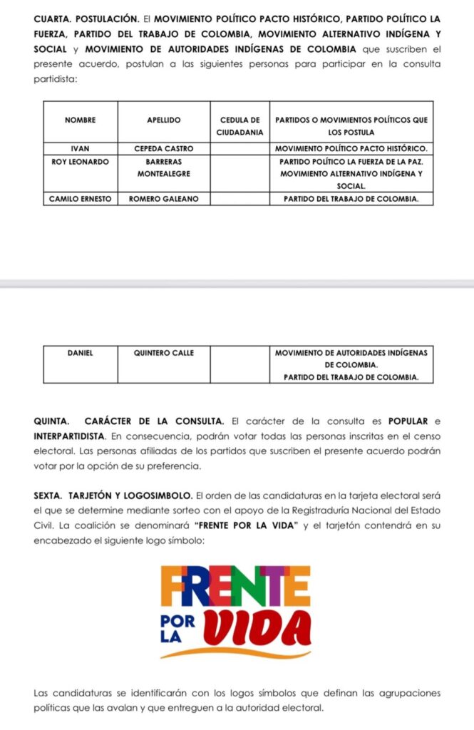 El acuerdo precisa, además, que el resultado de la consulta hará parte de un proceso más amplio de coalición política y de gobierno. La definición de la fórmula vicepresidencial quedará en manos del candidato presidencial ganador, en diálogo con las fuerzas que integran el Frente por la Vida y teniendo en cuenta criterios políticos, incluido el resultado del mecanismo de participación.
