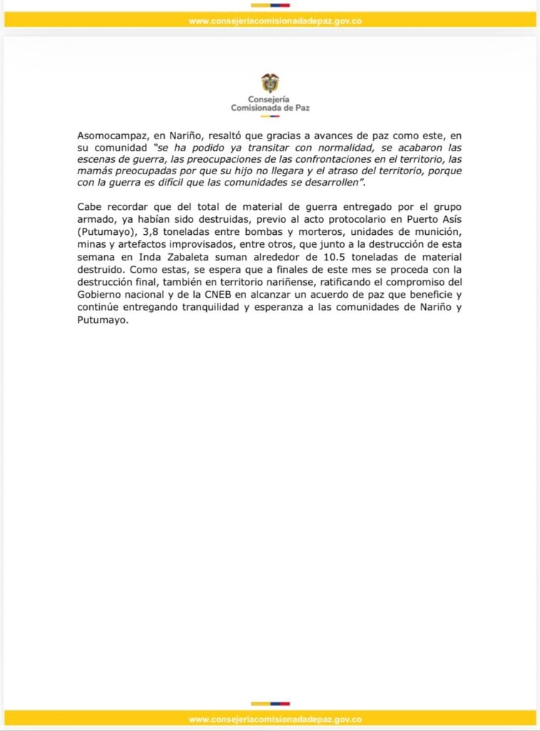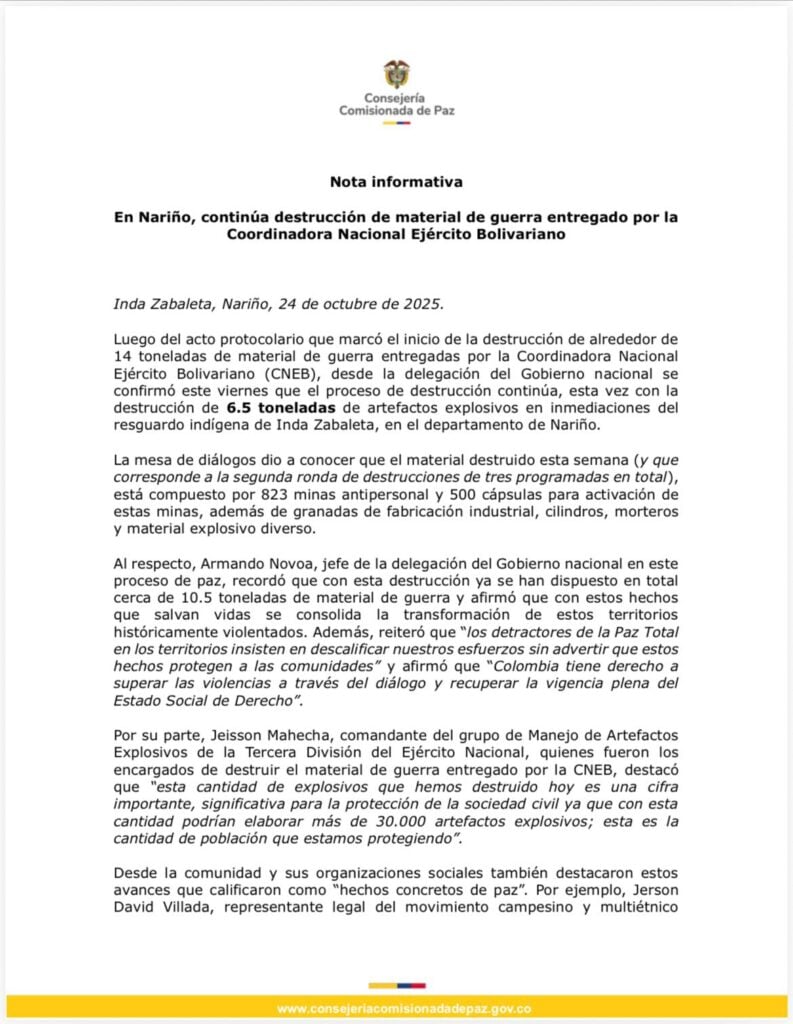 Armando Novoa, jefe de la delegación del Gobierno nacional en este proceso, recordó que, con lo destruido hasta el momento, se han dispuesto cerca de 10.5 toneladas de material de guerra. El funcionario señaló que estos resultados buscan contribuir a la protección de la población en territorios históricamente afectados y afirmó que “los detractores de la Paz Total en los territorios insisten en descalificar nuestros esfuerzos sin advertir que estos hechos protegen a las comunidades”. Además, indicó que “Colombia tiene derecho a superar las violencias a través del diálogo y recuperar la vigencia plena del Estado Social de Derecho”.
