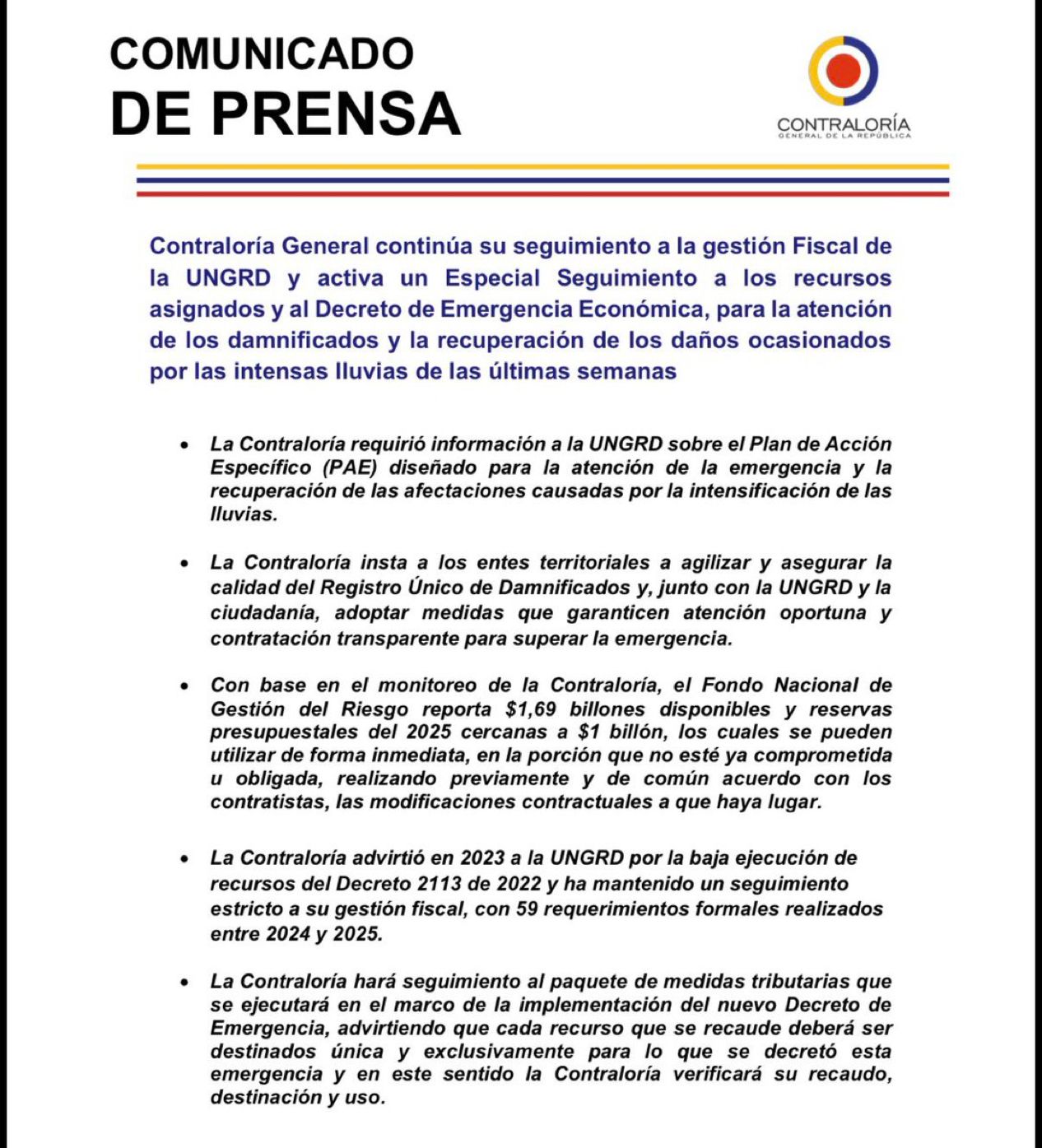 La entidad recordó además que en 2023 advirtió a la UNGRD por la baja ejecución de los recursos del Decreto 2113 de 2022 y que ha mantenido un seguimiento estricto a su gestión fiscal. Entre 2024 y 2025, indicó, se han realizado 59 requerimientos formales relacionados con esta materia.