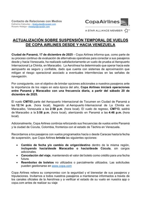 En relación con los pasajeros que tienen vuelos programados desde o hacia Caracas durante el periodo de suspensión, Copa Airlines recordó que mantiene habilitadas varias opciones. Estas incluyen el cambio de fecha del viaje, así como la modificación del origen o destino dentro de la misma región, con alternativas como Maracaibo o Cúcuta, sin cobros adicionales. También se ofrece la posibilidad de cancelar el itinerario y conservar el valor del boleto como crédito para una fecha futura, o solicitar el reembolso de boletos no utilizados o parcialmente utilizados.