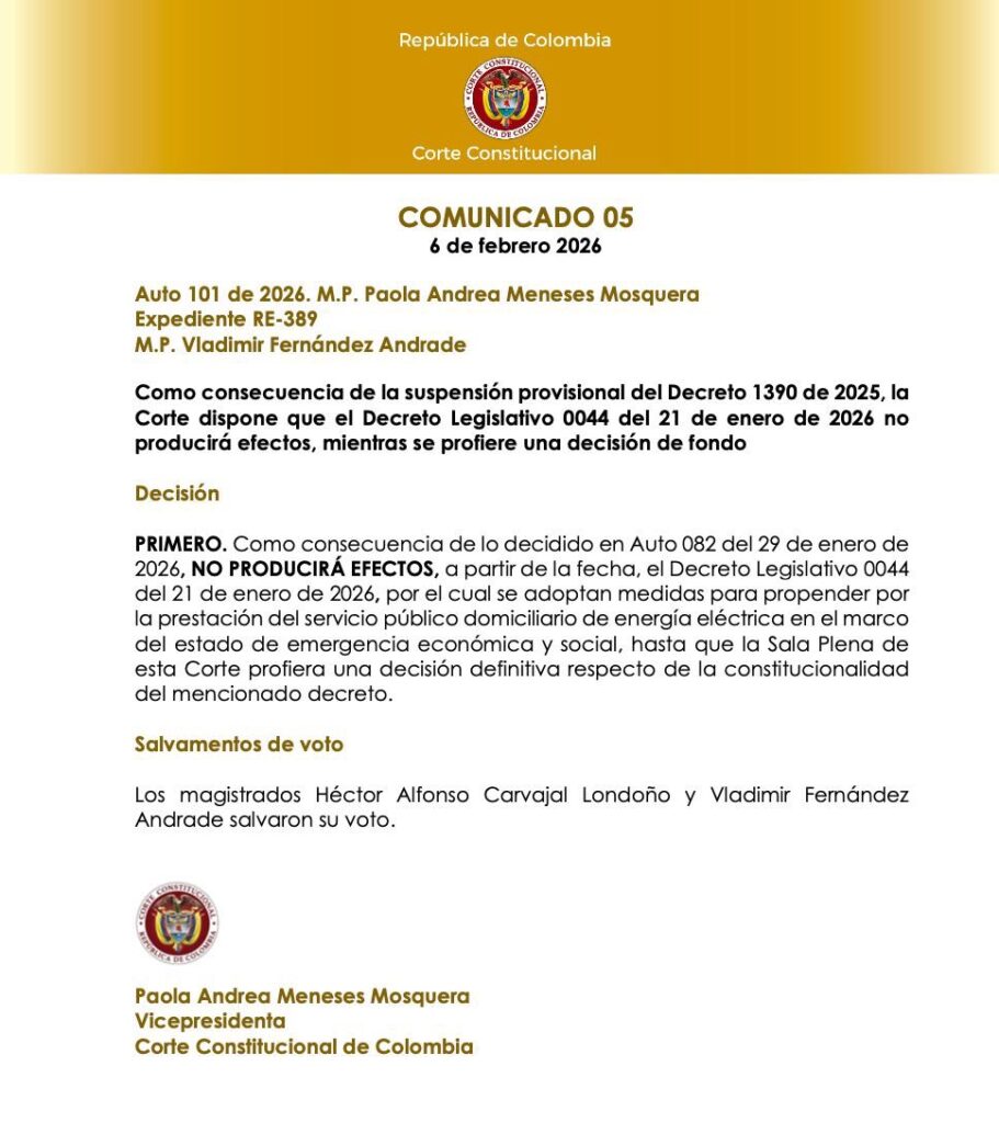 La Corte Constitucional suspendió de manera provisional el decreto 0044 de 2026, expedido por el Gobierno nacional en el marco de la emergencia económica y social, mediante el cual se establecían nuevos cobros a las empresas generadoras de energía eléctrica. La decisión implica que la norma deja de producir efectos mientras la Sala Plena del alto tribunal adopta un fallo definitivo sobre su constitucionalidad.