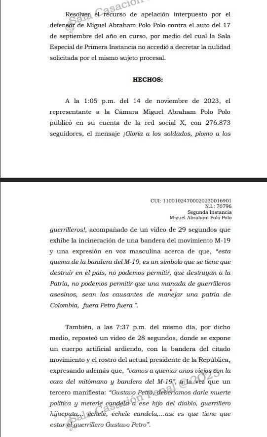 El expediente detalla que, a la 1:05 p. m. de ese día, Polo Polo publicó un mensaje en el que escribía: “¡Gloria a los soldados, plomo a los guerrilleros!”, acompañado de un video en el que se incineraba una bandera del M-19 mientras una voz calificaba a sus integrantes con expresiones ofensivas. Horas más tarde, a las 7:37 p. m., reposteó otro video en el que se veía la quema de un muñeco con el rostro del presidente Petro y la bandera del mismo movimiento, junto con expresiones que instaban a “meterle candela” al mandatario y a darle “muerte política”.