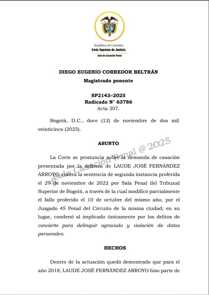 En su decisión, la Corte resolvió no casar el fallo del Tribunal Superior de Bogotá, que en noviembre de 2022 había condenado a Fernández por los delitos de concierto para delinquir agravado y violación de datos personales.