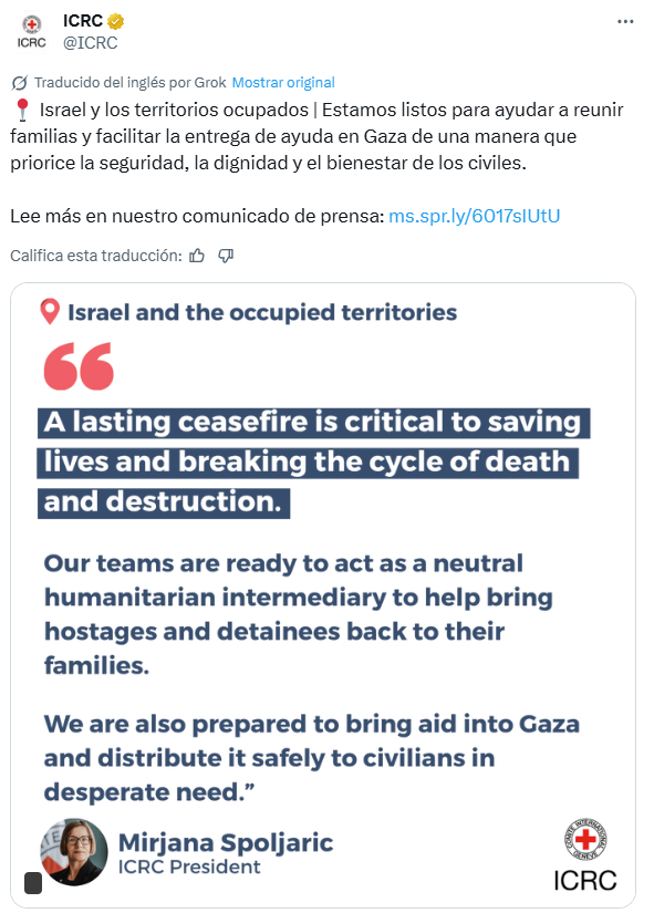 “Nuestros equipos están preparados para actuar como intermediarios humanitarios neutrales para ayudar a que los rehenes y detenidos regresen con sus familias; y también estamos preparados para llevar ayuda a Gaza y distribuirla de forma segura”, señaló Spoljaric en un comunicado difundido por la organización.