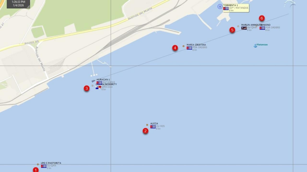 De acuerdo con los registros disponibles, al menos seis barcos se encontraban fondeados en Matanzas a comienzos de enero, muy cerca del muelle que alimenta la base de supertanqueros. A este grupo se sumaría un séptimo navío en las horas siguientes, reforzando la percepción de que el régimen cubano estaría reorganizando sus reservas de combustible en uno de los principales puntos de almacenamiento del país.