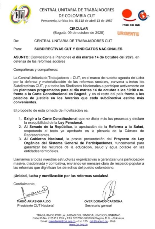 La Central Unitaria de Trabajadores de Colombia (CUT) convocó una jornada nacional de manifestaciones para el próximo martes 14 de octubre con el objetivo de exigir avances en las reformas sociales impulsadas por el Gobierno nacional, en particular la pensional y la de salud.
