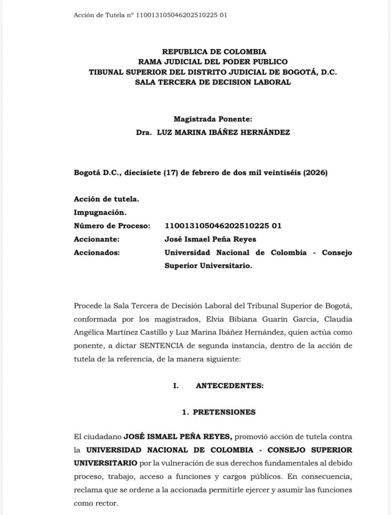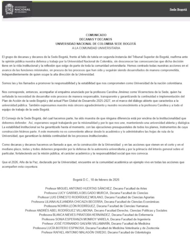 Las decanas y los decanos de la sede Bogotá de la Universidad Nacional emitieron un pronunciamiento colectivo en el que pidieron a la comunidad académica mantener sin modificaciones los planes institucionales en curso, luego del fallo del Tribunal Superior de Bogotá que ordenó la restitución de José Ismael Peña en la rectoría.