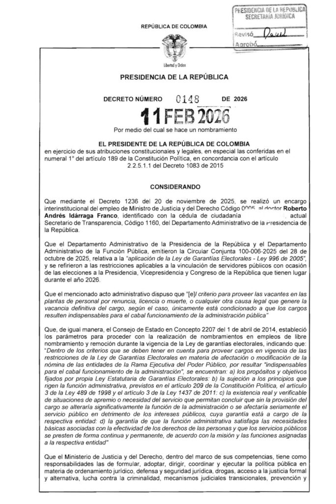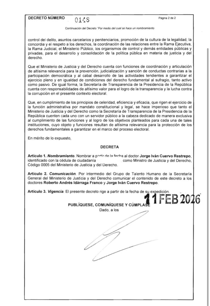 El presidente de la República expidió el Decreto 0148 del 11 de febrero de 2026 mediante el cual oficializó el nombramiento de Jorge Iván Cuervo Restrepo como ministro de Justicia y del Derecho.