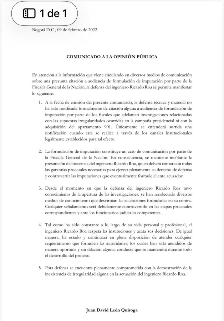 A través de un comunicado dirigido a la opinión pública, la defensa indicó que no ha recibido comunicación oficial por canales institucionales sobre diligencias asociadas a investigaciones por presuntas irregularidades en la campaña presidencial ni sobre otros hechos mencionados en reportes periodísticos.