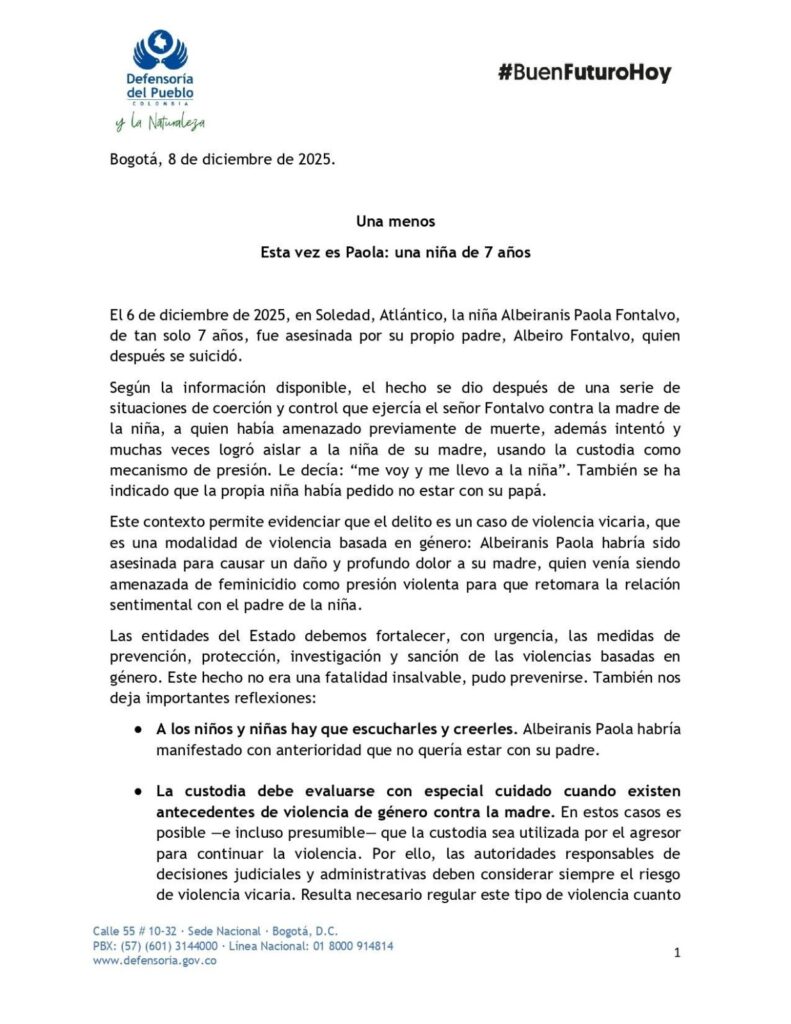 La Defensoría del Pueblo encendió las alarmas por un nuevo caso de violencia vicaria en el país, esta vez en Soledad, Atlántico, donde el 6 de diciembre fue asesinada la niña Albeiranis Paola Fontalvo, de 7 años, a manos de su propio padre, Albeiro Fontalvo, quien posteriormente se quitó la vida.