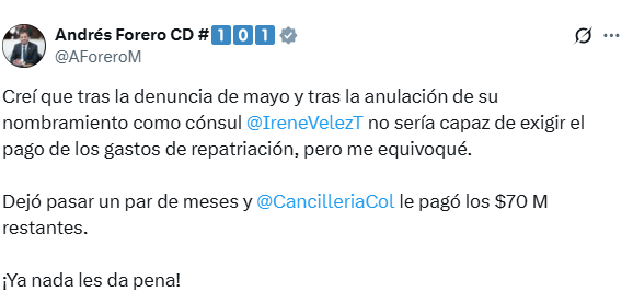 Forero afirmó que desde mayo había advertido al Gobierno sobre los pagos relacionados con la salida del servicio exterior. A su juicio, la entonces cónsul no habría completado el tiempo requerido para acceder a estos beneficios. El congresista sostuvo que, aun con la advertencia, en agosto se realizaron las consignaciones que sumarían cerca de 90 millones de pesos.