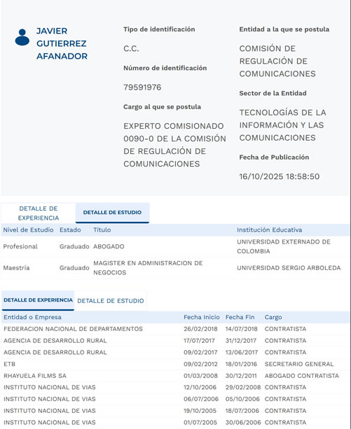El Gobierno Nacional designó a Javier Gutiérrez Afanador como nuevo comisionado de la Comisión de Regulación de Comunicaciones (CRC), una decisión que ha generado debate debido a que, según reportes conocidos, el funcionario no cumpliría con todos los requisitos establecidos para ocupar el cargo.