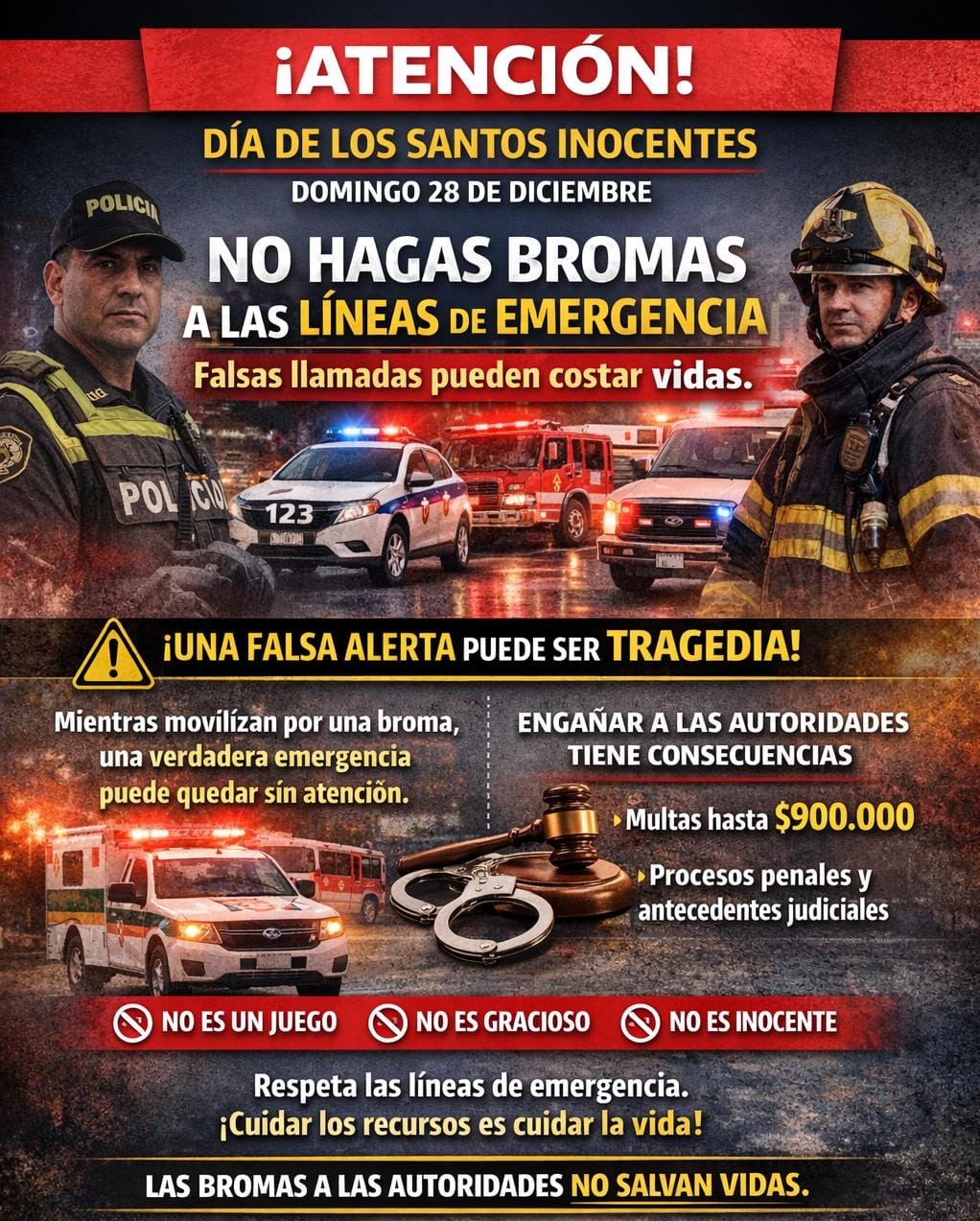 Con la llegada del Día de los Santos Inocentes, las autoridades reiteraron un llamado urgente a la ciudadanía para que esta fecha no sea utilizada como excusa para realizar bromas a las líneas de emergencia. Llamadas falsas o reportes inexistentes a números como el 123, Policía, Bomberos o servicios de ambulancia generan graves consecuencias para la seguridad y pueden poner en riesgo vidas humanas.