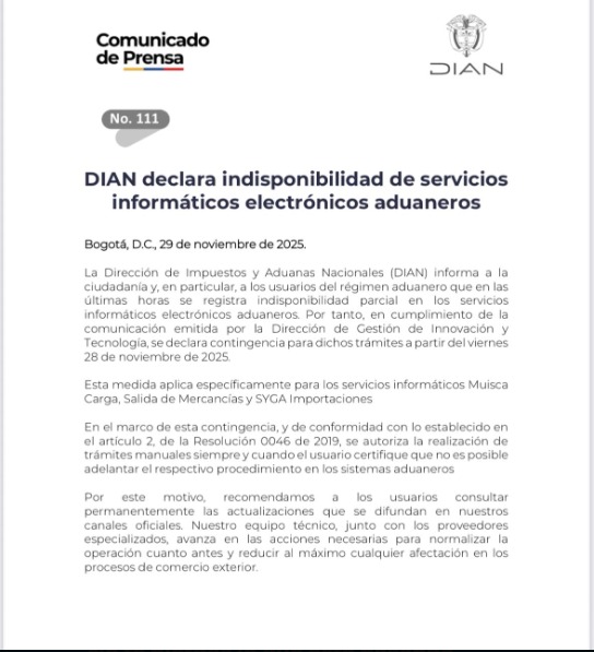 La decisión busca evitar afectaciones mayores a los importadores, exportadores, agentes de carga y demás actores del comercio exterior, permitiendo que las operaciones continúen bajo mecanismos de contingencia mientras se realizan los ajustes técnicos necesarios. La DIAN recordó que estos procedimientos manuales están contemplados en la normativa aduanera para situaciones excepcionales en las que la plataforma tecnológica no se encuentre disponible.