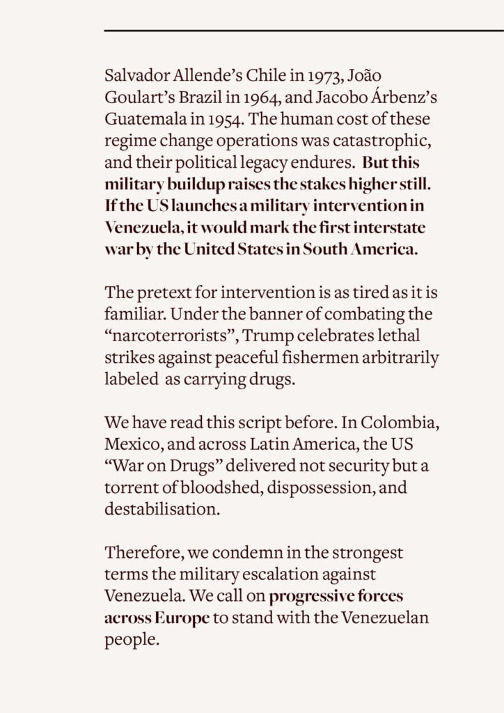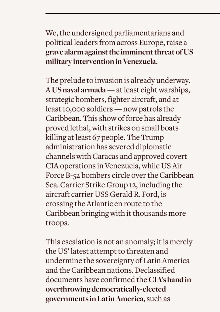 Un grupo de más de 60 diputados provenientes de distintos países europeos difundió una carta abierta en la que manifiestan preocupación por el incremento de la presencia militar de Estados Unidos en el Caribe, en zonas cercanas a Venezuela.