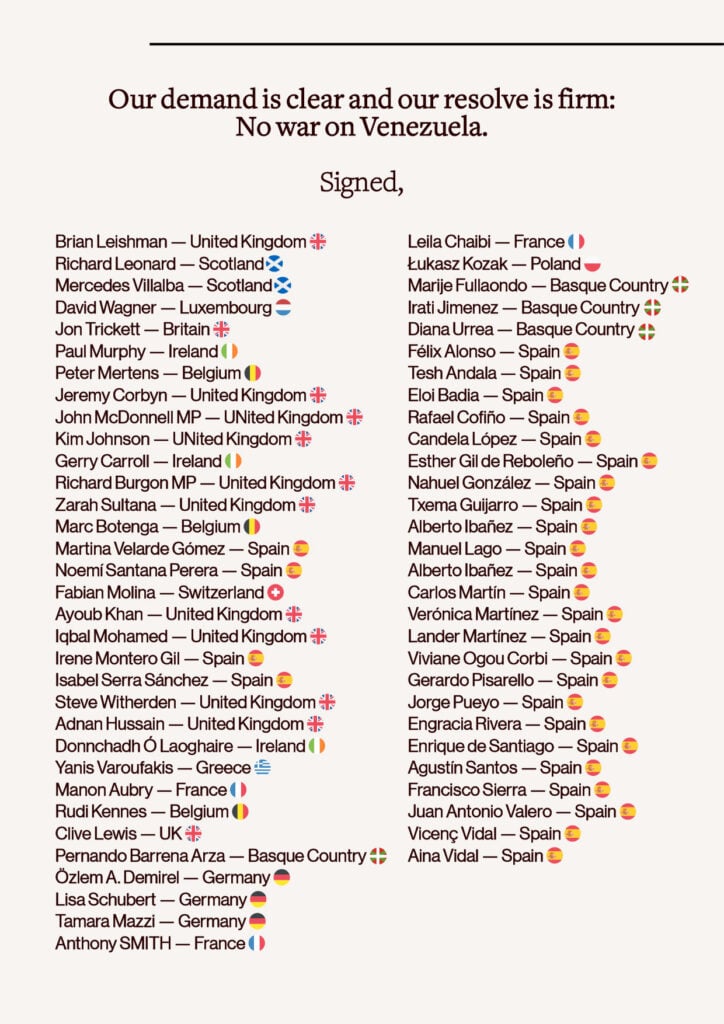 La comunicación fue divulgada por la organización Internacional Progresista y reúne firmas de parlamentarios vinculados a diversas fuerzas políticas, entre ellas Podemos, Sumar y Bildu, además de representantes de Francia, Italia, Portugal y figuras internacionales como Jeremy Corbyn y Yanis Varoufakis.