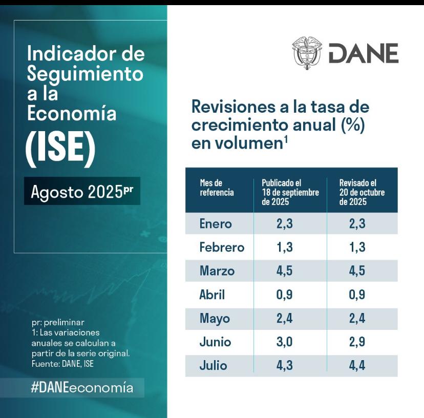 La entidad también publicó una revisión de las tasas de crecimiento anual en volumen correspondientes a los meses previos, donde se evidencian ajustes mínimos en las cifras de junio (de 3,0% a 2,9%) y julio (de 4,3% a 4,4%). Los demás meses del año mantienen los valores previamente reportados, lo que indica estabilidad en la tendencia general del crecimiento durante 2025.