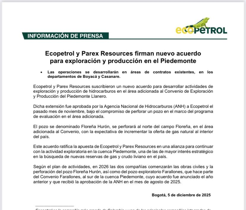 El acuerdo también reafirma la continuidad de la alianza estratégica entre Ecopetrol y Parex Resources en la cuenca Piedemonte, región considerada clave para el hallazgo de nuevas reservas. Las compañías señalaron que esta zona se mantiene como una prioridad en la búsqueda de gas y crudo liviano. En palabras del comunicado, el propósito es consolidar una ruta de exploración en “una de las de mayor interés estratégico en la búsqueda de nuevas reservas de gas y crudo liviano en el país”.