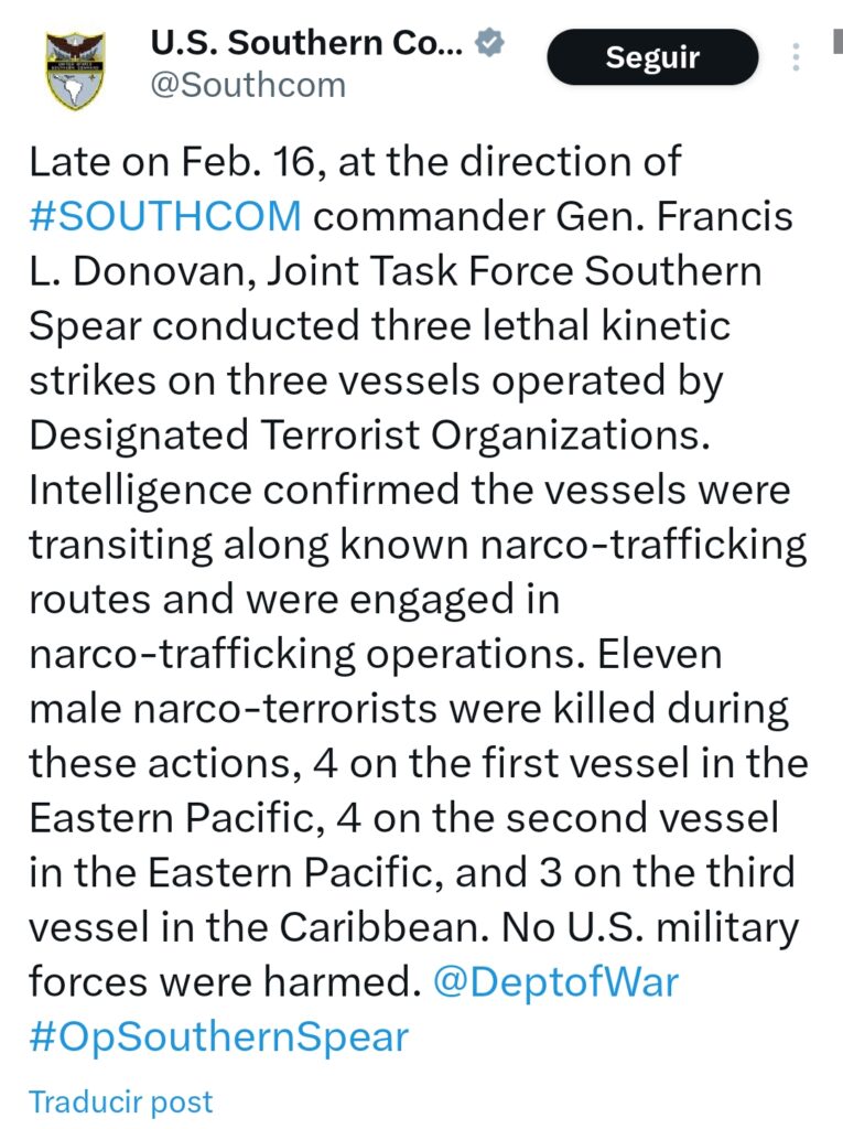 De acuerdo con el reporte militar, dos de los ataques se llevaron a cabo en el Pacífico oriental, donde murieron cuatro personas en cada una de las embarcaciones impactadas, mientras que el tercero ocurrió en el Caribe y dejó tres muertos. El Comando Sur señaló que la inteligencia estadounidense había identificado a las naves transitando por rutas que, según sus datos, son conocidas por ser utilizadas en actividades de narcotráfico.