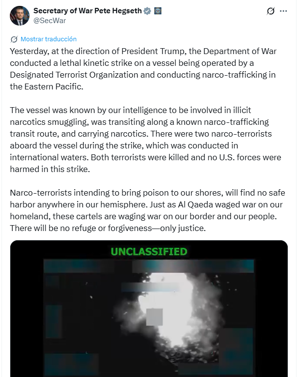 La operación fue ordenada directamente por el presidente Donald Trump, según indicó Hegseth, quien publicó en su cuenta de X un video del momento del ataque. “Bajo la dirección del presidente Trump, el Departamento de Guerra llevó a cabo un ataque cinético letal contra un buque operado por una organización terrorista dedicada al narcotráfico. Nuestra inteligencia identificó que transportaba narcóticos por una ruta conocida del Pacífico”, afirmó.