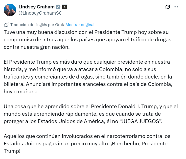 “El presidente Trump es más duro que cualquier otro en nuestra historia y me informó que va a golpear a Colombia, no solo a sus narcotraficantes, sino también donde más le duele: en el bolsillo. Anunciará importantes aranceles contra Colombia hoy o mañana”, señaló Graham en su publicación.